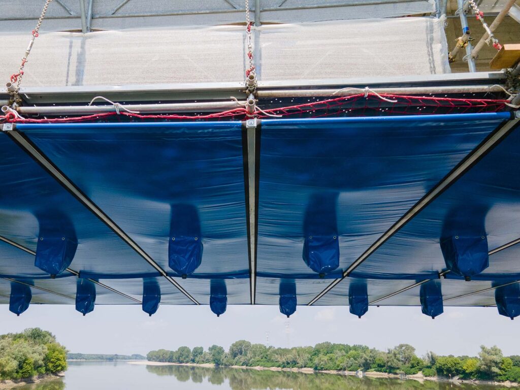 Le sacche di raccolta sono inoltre dotate di fori di troppo pieno, progettati dal reparto tecnico Pilosio in base alla portata del sistema FlyDeck, per prevenire l’accumulo di acqua piovana e garantire continuità di funzionamento anche in condizioni meteo difficili.