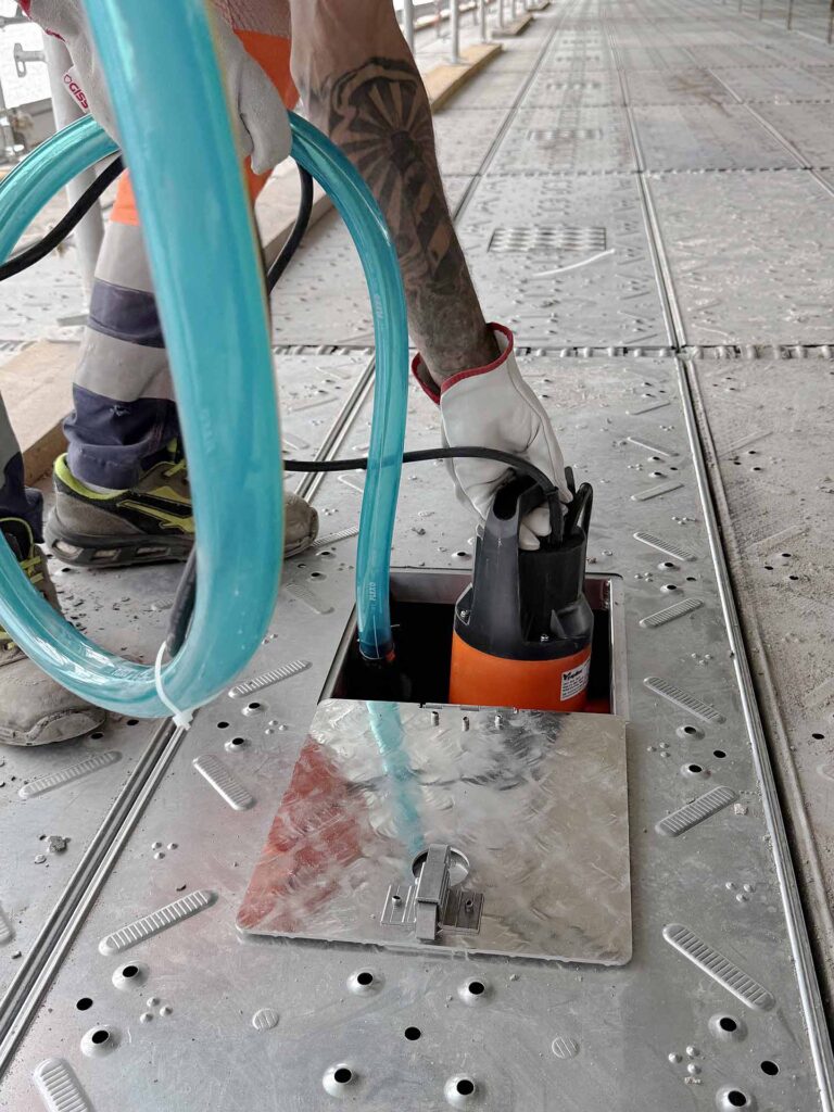 È composto da una vasca convogliatrice in PVC dotata di sacche di raccolta, installata sotto le travi del ponteggio sospeso FlyDeck in fase di montaggio.