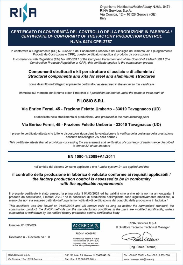 La UNI EN 1090-1:2009 + A1:2011 è una certificazione che disciplina l’immissione nel mercato di prodotti da costruzione e di componenti strutturali in acciaio e alluminio. Non è obbligatoria per attrezzature provvisorie.