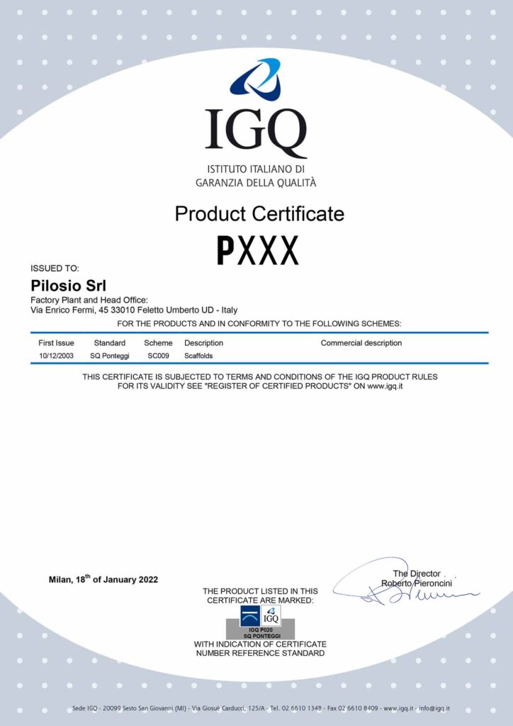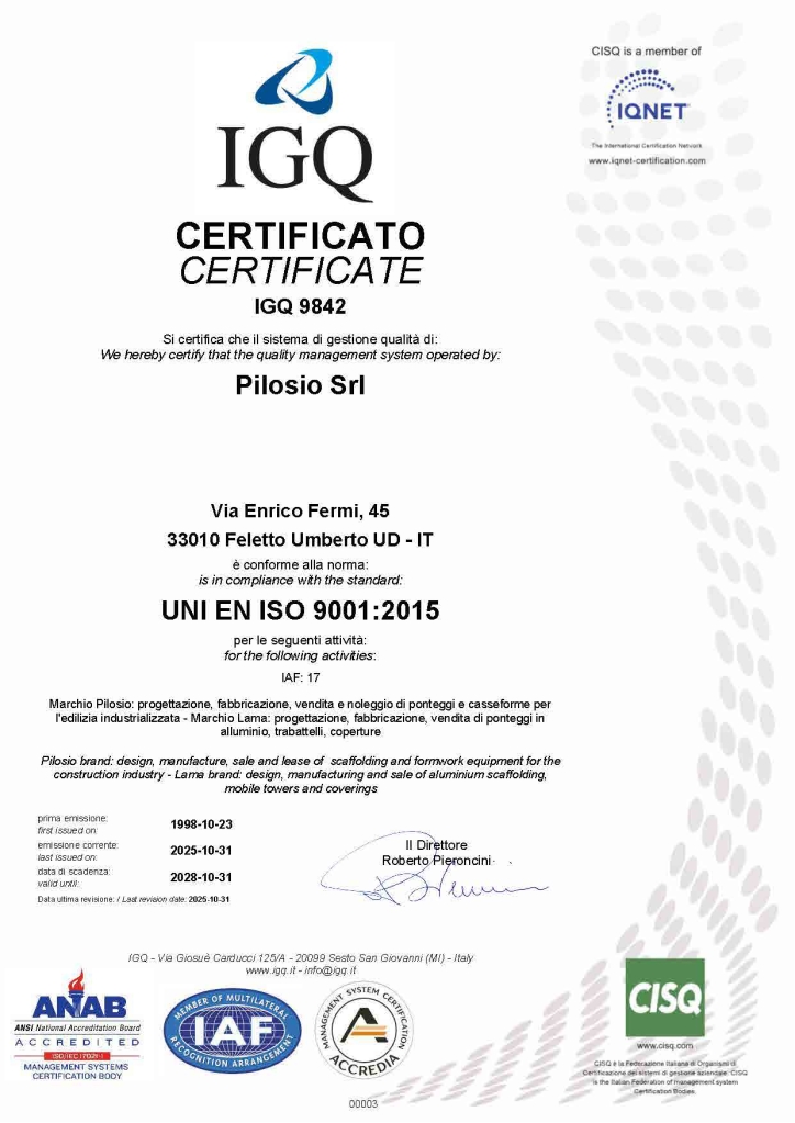 Da molti anni Pilosio ha aderito al Marchio di Qualità SQ Ponteggi adottando dei requisiti di qualità del sistema di produzione del ponteggio, più restrittivi rispetto a quelli previsti dalla Autorizzazione Ministeriale (tolleranze di lavorazione, saldatura ecc.).