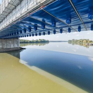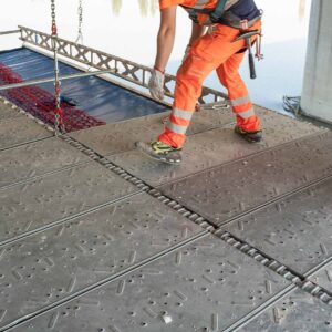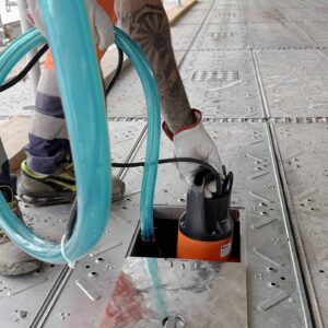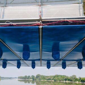 È composto da una vasca convogliatrice in PVC dotata di sacche di raccolta, installata sotto le travi del ponteggio sospeso FlyDeck in fase di montaggio.